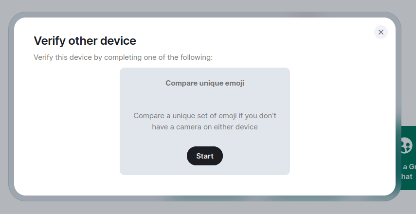 When you first sign-in to Element Web on a device, you should be presented with this screen requesting verification: